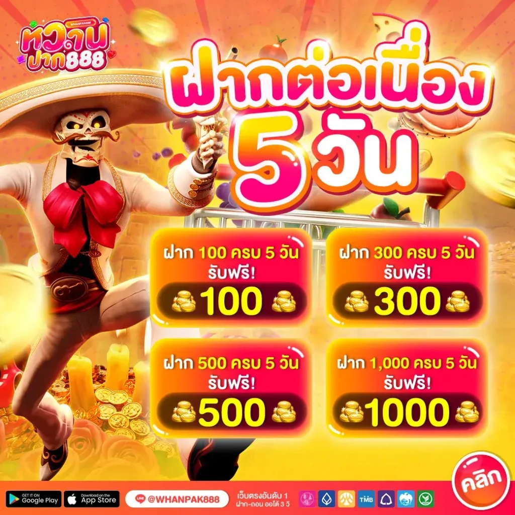 ใครที่ชอบความสม่ำเสมอ เรามีโปรโมชั่นสำหรับการฝากต่อเนื่อง! เพียงฝาก 100, 300, 500 หรือ 1,000 บาทต่อเนื่อง 5 วัน คุณก็มีสิทธิ์รับทองคำฟรีไปเลย รางวัลพิเศษสำหรับผู้ที่ไม่หยุดเดิมพันกับเรา มาร่วมกันเก็บสะสมรางวัลทุกวันกันนะคะ